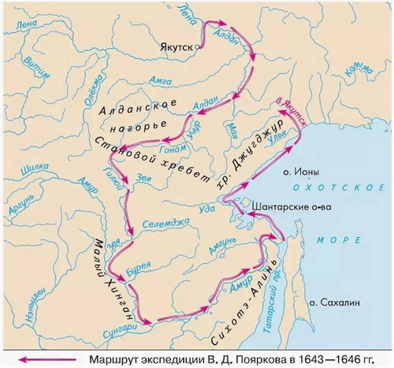 В состав отряда Пояркова входило 133 человека, оснащенных пищалями, пушкой со 100 ядрами к ней. Поярков вышел из Якутска 15 июля 1643 и за 2 дня на 6 дощаниках спустился по реке Лене до устья Алдана. Затем приходилось плыть против течения, что существенно замедлило продвижение экспедиции. Путь от Алдана до устья реки Учур занял месяц. Движение по Учуру продолжалось десять дней, после чего суда Пояркова свернули на реку Гонам. Та как судоходство по Гонаму возможно лишь на 200 километров от устья, а дальше начинаются пороги, людям Пояркова приходилось перетаскивать суда на себе, волоком. И это приходилось делать более 40 раз. Путь по реке Гонам занял 5 недель.